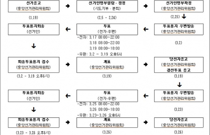¿ìÆí °á¼±ÅõÇ¥´Â ¿À´Â 3¿ù 23ÀϺÎÅÍ 26ÀÏ ¿ÀÈÄ 6½Ã±îÁö, ÀüÀÚ °á¼±ÅõÇ¥´Â 3¿ù 25¡¤26ÀÏ ÀÌÆ² °£¿¡ °ÉÃÄ ÁøÇàµÈ´Ù. 25ÀÏÀº ¿ÀÀü 8½ÃºÎÅÍ ¿ÀÈÄ 10½Ã±îÁö, 26ÀÏÀº ¿ÀÀü 8½ÃºÎÅÍ ¿ÀÈÄ 6½Ã±îÁö´Ù.