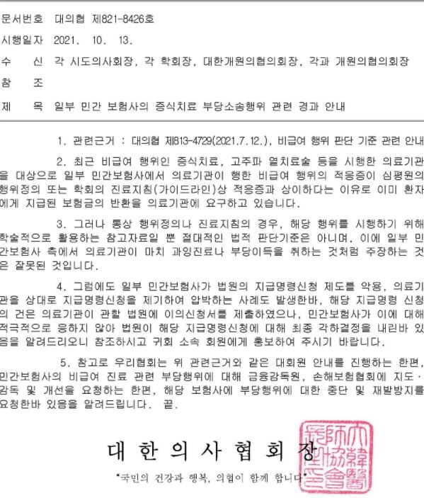 ¹Î°£º¸Çè»çµéÀÌ Áõ½ÄÄ¡·á¡¤°íÁÖÆÄ ¿­Ä¡·á¼ú µîÀÌ ½ÉÆò¿ø ÇàÀ§Á¤ÀÇ È¤Àº ÇÐȸ Áø·áÁöħ ÀûÀÀÁõ°ú ´Ù¸£´Ù´Â ÀÌÀ¯·Î ¹ý¿øÀÇ Áö±Þ¸í·É½Åû Á¦µµ¸¦ ÀÌ¿ëÇÏ°í ³ª¼¹´Âµ¥, ÀÌ¿¡ ´ëÇØ ¡®Áø·á±Ç Ä§ÇØ¡¯¸¦ µé¾î ¸Â¼­°í ÀÖ´Â Çü±¹ÀÌ´Ù.