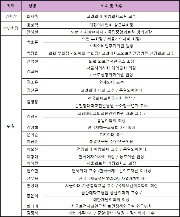 À§¿øÈ¸ À§¿øÀåÀº ÃÖÀç¿í ±³¼ö(°í·ÁÀÇ´ë ¿¹¹æÀÇÇб³½Ç)°¡ ¸Ã¾ÒÀ¸¸ç, ³²ºÏ ÅëÀϽô븦 ´ëºñÇÑ ÅëÀÏÀÇÇÐ ¹× ÀÇ·áÇù·Â »ç¾÷ÀÇ ¿øÈ°ÇÑ ÃßÁøÀ» À§ÇØ À§¿øÈ¸ ¿µ¹® ¸íĪ(Inter-Korea Medical Cooperation of Korea Medical Association)À» »õ·Ó°Ô ±ÔÁ¤Çß´Ù.