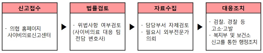 »çÀ̺ñÀÇ·á½Å°í¼¾ÅÍ´Â ´ëÇÑÀÇ»çÇùȸ ȨÆäÀÌÁö(www.kma.org) ³» '»çÀ̺ñÀÇ·á½Å°í¼¾ÅÍ' °Ô½ÃÆÇÀ» °³¼³ÇØ »çÀ̺ñÀÇ·á¿¡ ´ëÇÑ ¨ç½Å°í¸¦ ¹Þ°í ¨èÀ§¹ý»çÇ׿¡ ´ëÇÑ ¹ý·ü°ËÅä ¨é»ç½Ç ¿©ºÎ È®ÀÎ ¹× ÀÚ·á¼öÁý ¨ê°í¼Ò¡¤°í¹ß µî ¹ýÀû Á¶Ä¡¸¦ ÇÏ´Â ¹æ½ÄÀ¸·Î ¿î¿µµÈ´Ù.