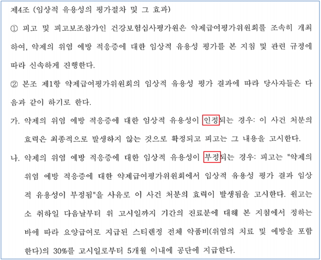 ÀÇ¿øÇùȸ ¼³¸í¿¡ µû¸£¸é ¼¿ï°íµî¹ý¿øÀÇ Á¶Á¤±Ç°í¾È Á¦4Á¶Á¦2Ç׿¡´Â ¾àÆòÀ§ÀÇ Æò°¡ °á°ú ¾àÁ¦ÀÇ À§¿° ¿¹¹æ ÀûÀÀÁõ¿¡ ´ëÇÑ ÀÓ»óÀû À¯¿ë¼ºÀÌ 'ÀÎÁ¤'µÇ¸é ÀÌ »ç°Ç óºÐÀÇ È¿·ÂÀº ¹ß»ýÇÏÁö ¾ÊÀº °ÍÀ¸·Î È®Á¤µÇ°í, ÀÓ»óÀû À¯¿ë¼ºÀÌ 'ºÎÁ¤'µÇ¸é µ¿¾ÆST´Â ¼Ò ÃëÇÏÀÏ ´ÙÀ½³¯ºÎÅÍ °í½ÃÀϱîÁö ±â°£ÀÇ Áø·áºÐ¿¡ ´ëÇØ ¿ä¾ç±Þ¿©·Î Áö±ÞµÈ ½ºÆ¼·»Á¤ Àüü ¾àǰºñÀÇ 30%¸¦ °ø´Ü¿¡ Áö±ÞÇϵµ·Ï Çß´Ù. ÇÏÁö¸¸ ½ÉÆò¿ø ¾àÆòÀ§°¡ ÀÎÁ¤ ¶Ç´Â ºÎÁ¤ÀÌ ¾Æ´Ñ 'ºÒÈ®½Ç'·Î °á·ÐÀ» ³»¸®¸é¼ µ¿¾ÆST´Â ¼ö½Ê¿¡¼ ¼ö¹é ¾ï ¿ø¿¡ ´ÞÇÏ´Â ±Ý¾×À» Àý¾àÇÒ ¼ö ÀÖ°Ô µÆ´Ù.