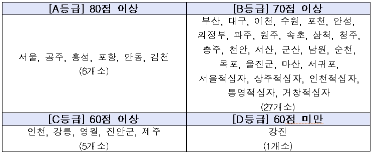 Æò°¡°á°ú ¼¿ï¡¤°øÁÖ¡¤È«¼º¡¤Æ÷Çס¤¾Èµ¿¡¤±èõÀÇ·á¿ø 6°³ ±â°üÀÌ Aµî±ÞÀ» Â÷ÁöÇßÀ¸¸ç, Àüü Æò±ÕÀº 75.2Á¡À̾ú´Ù. µî±Þº°·Î´Â 80Á¡ ÀÌ»óÀ» ¹ÞÀº Aµî±ÞÀÌ 6°³¼Ò, 70Á¡ ÀÌ»óÀÎ Bµî±ÞÀº 27°³¼Ò, 60Á¡ ÀÌ»óÀº Cµî±ÞÀº 5°³¼Ò, 60Á¡ ¹Ì¸¸ÀÎ Dµî±ÞÀº 1°³¼ÒÀÌ´Ù.