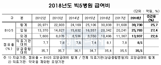 Áö³­ÇØ ¡®ºò5º´¿ø¡¯À¸·Î ²ÅÈ÷´Â ¼­¿ï ´ëÇüº´¿ø 5°÷(»ï¼º¼­¿ïº´¿ø, ¼­¿ï´ëº´¿ø, ¼­¿ï¼º¸ðº´¿ø, ¼¼ºê¶õ½ºº´¿ø)ÀÌ °¡Á®°£ ¿ä¾ç±Þ¿©ºñ°¡ 4Á¶¿ø¿¡ À°¹ÚÇÒ Á¤µµ·Î ±ÞÁõÇß´Ù. ºò5º´¿ø¿¡ Áö±ÞµÈ ¿ä¾ç±Þ¿©ºñ´Â 1³â ¸¸¿¡ 25.7%³ª Áõ°¡Çß´Ù.