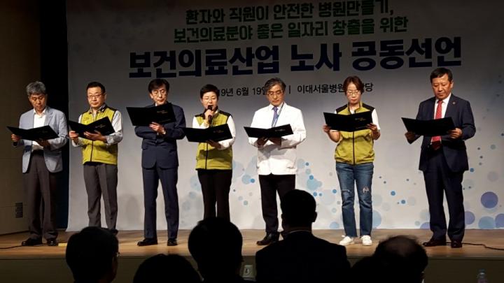 À̳¯ º¸°ÇÀÇ·á»ê¾÷ ³ë»ç ¾çÃøÀº °øµ¿¼±¾ð¹® ³¶µ¶À» ÅëÇØ ȯÀÚ¿Í Á÷¿øÀÌ ¾ÈÀüÇÑ ÀÇ·áȯ°æÀ» ¸¸µé°í º¸°ÇÀÇ·áºÐ¾ß ÁÁÀº ÀÏÀÚ¸®¸¦ âÃâÇÏ´Â °ÍÀÌ »çȸÀû¡¤±¹°¡Àû °úÁ¦ÀÓÀ» È®ÀÎÇß´Ù. ¶ÇÇÑ ¡ãÀÇ·á±â°ü ³» Æø¾ð¡¤ÆøÇࡤ¼ºÈñ·Õ ±ÙÀý, ÀÇ·á»ç°í¿Í ¾ÈÀü»ç°í ¿¹¹æÀ» À§ÇÑ »çȸÀû Ã¥¹«¸¦ ´ÙÇÒ °Í ¡ã½Å±Ô°£È£»ç ±³À°Àü´ã °£È£»ç È®Ãæ µî ÁÁÀº ÀÏÀÚ¸®¸¦ ¸¸µé±â À§ÇØ °øµ¿ ³ë·ÂÇÒ °Í ¡ãÀÇ·áÀΰú ¾à»çÀηÂÀ» È®ÃæÇϱâ À§ÇÑ ½ÇÈ¿¼º ÀÖ´Â ¹æ¾ÈÀ» ¸¶·ÃÇÏ¿© ÃßÁøÇÒ °Í µîÀ» ¼±¾ðÇß´Ù.