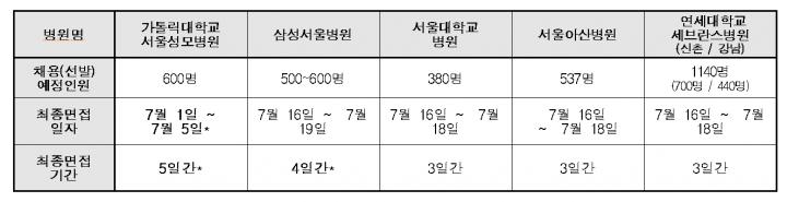ÀÌ¿¡ µû¶ó ¼­¿ï´ëº´¿ø°ú »ï¼º¼­¿ïº´¿ø, ¼­¿ï¾Æ»êº´¿ø, ¿¬¼¼´ë ¼¼ºê¶õ½ºº´¿ø(½ÅÃÌ/°­³²) 4°÷Àº Áö³­ 7¿ù16ÀϺÎÅÍ 18ÀϱîÁö »çÈê°£ °£È£»ç ½Å±Ôä¿ë ÃÖÁ¾¸éÁ¢À» µ¿½Ã¿¡ ½Ç½ÃÇß´Ù. »ï¼º¼­¿ïº´¿øÀº ¸éÁ¢ ÀÏÁ¤À» ÇÏ·ç ´õ ´Ã·Á 19ÀϱîÁö ÁøÇàÇß´Ù.