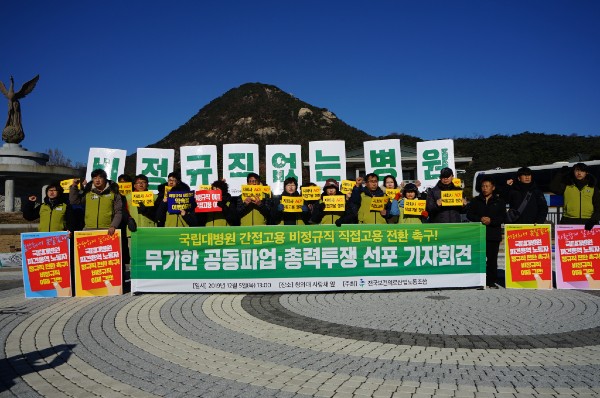 Á÷Á¢°í¿ë ÇüÅ·ΠºñÁ¤±ÔÁ÷ÀÇ Á¤±ÔÁ÷ ÀüȯÀ» ¿ä±¸ÇÏ´Â 4°³ ±¹¸³´ëº´¿ø ³ëµ¿ÀÚµéÀÌ ¿À´Â 10ÀϺÎÅÍ ¹«±âÇÑ °øµ¿ÆÄ¾÷¿¡ µ¹ÀÔÇÏ°Ú´Ù°í ¼±Æ÷ÇÏ¸ç º´¿øµéÀ» ¾Ð¹ÚÇÏ°í ³ª¼¹´Ù.