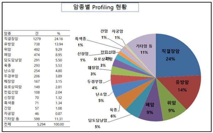 ¼öÁýµÈ À¯ÀüüÀÇ ¾ÏÁ¾ ȯÀÚ¸¦ »ìÆìº¸¸é Á÷°áÀå¾Ï ȯÀÚ°¡ 24%·Î °¡Àå ¸¹°í, À¯¹æ¾Ï 14%, À§¾Ï 9%, Æó¾Ï 9%, ´ãµµ´ã³¶¾Ï, À°Á¾, ³¼Ò¾Ï, µÎ°æºÎ¾Ï, ÃéÀå¾Ï, ¿ä·Î»óÇÇ¾Ï ¼øÀ̾ú´Ù.