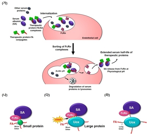 ÀÌ¿¡ ¿¬±¸ÁøÀº Å©±â°¡ Å« Ä¡·á¿ë ´Ü¹éÁúÀÌ ÁöÁúü °áÇÕ¿¡ ÀÇÇØ ¹Ý°¨±â Áõ´ë°¡ ÀϾÁö ¾Ê´Â ÀÌÀ¯¿¡ ´ëÇØ ¾ËºÎ¹Î¿¡ ºÙÀº ÁöÁúü°¡ °áÇÕµÈ Å©±â°¡ Å« ´Ü¹éÁúÀ» ±¸Á¶ÀûÀ¸·Î È®ÀÎÇß°í FcRn(¼¼Æ÷¸·¿¡ Àִ Ư¼öÇÑ ¼ö¿ëü)°ú Ãæµ¹À» ÀÏÀ¸Å³ ¼ö ÀÖ´Ù´Â °¡¼³À» ¼¼¿ü´Ù.
