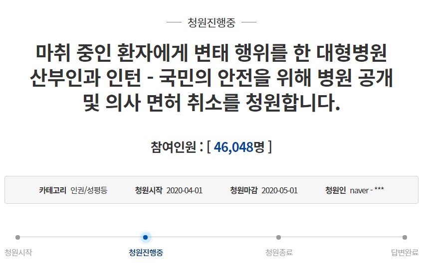 ÀÎÅÏ B¾¾ÀÇ ÀÇ»ç ¸éÇã ¹ÚÅ»À» Ã˱¸ÇÏ´Â ÇØ´ç ±¹¹Îû¿øÀº ÇöÀç(5ÀÏ ±âÁØ) 4¸¸6,048¸íÀÌ ÁöÁöÇß´Ù.