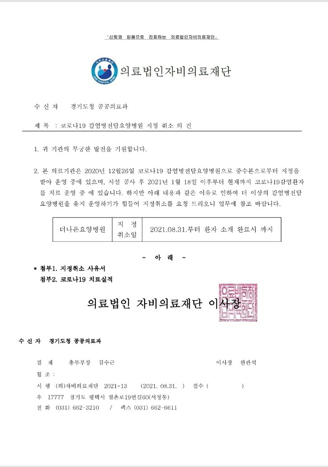 Áö³ 1¿ù Äڷγª19 Àü´ã¿ä¾çº´¿øÀ¸·Î ÀüȯÇÑ °æ±âµµ ÆòÅýà ´õ³ªÀº¿ä¾çº´¿øÀº 8¿ù 31ÀÏ °æ±âµµ¿¡ Àü´ãº´¿ø ÁöÁ¤À» Ãë¼ÒÇØ ´Þ¶ó´Â °ø¹®À» º¸³Â´Ù. Áß¾Ó»ç°í¼ö½Àº»ºÎ(Áß¼öº»)À¸·ÎºÎÅÍ 7¿ù ¼Õ½Çº¸»ó±ÝÀ» ÇÑ Ç¬µµ ¹ÞÁö ¸øÇ߱⠶§¹®ÀÌ´Ù.