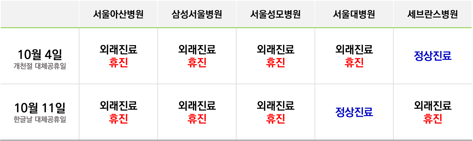 Áö³ 8¿ù ±¤º¹Àý ´ëü°øÈÞÀÏ¿¡ ÁÖ¿ä ´ëÇüº´¿øµéÀÌ ¸ðµÎ Á¤»óÁø·á¸¦ ½Ç½ÃÇß´ø °¡¿îµ¥, À̹ø 10¿ù °³ÃµÀý°ú Çѱ۳¯ ´ëü°øÈÞÀÏ¿¡´Â ¸¹Àº º´¿øÀÌ ¿Ü·¡Áø·á¸¦ ½Ç½ÃÇÏÁö ¾Ê´Â´Ù.