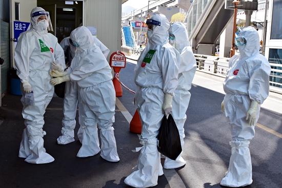 Äڷγª19 Áö¿ª°ÅÁ¡º´¿øÀÎ °è¸í´ëÇб³ ´ë±¸µ¿»êº´¿ø¿¡¼­ ÀÇ·áÁøµéÀÌ ¹æÈ£º¹¡¤¸¶½ºÅ© µî º¸È£À屸¸¦ Âø¿ëÇϰí ÀÖ´Ù.