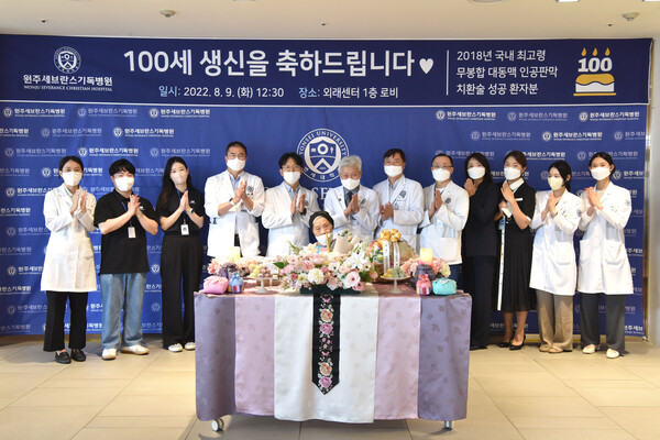 ¿øÁÖ¼¼ºê¶õ½º±âµ¶º´¿øÀº °Ç°ÇÑ ¸ð½ÀÀ¸·Î 100¼¼¸¦ ¸ÂÀÌÇϽŠÇÒ¸Ó´ÏÀÇ ¶æ±íÀº »ýÀÏÀ» ±â³äÇϰíÀÚ À̹ø Çà»ç¸¦ ¸¶·ÃÇß°í, Çà»çÀå¿¡´Â º´¿ø ¹× ¿øÁÖ ¹ä»ó°øµ¿Ã¼»çȸº¹Áö°ü °ü°èÀÚ¿Í ³»¿ø°´µéÀÌ ¸ð¿© ÇÒ¸Ó´ÏÀÇ »ýÀÏÀ» ÃàÇÏÇß´Ù.