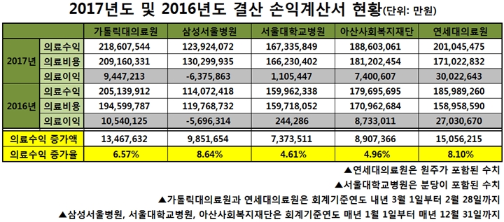 ¼­¿ï´ëÇб³º´¿øÀº 2017³â¿¡ ÀÇ·áÀÌÀÍÀ» 2016³â(24¾ï)ÀÇ 5¹è¿¡ °¡±î¿î 110¾ï ¿ø °¡·®À» ³²°åÀ¸³ª »ï¼º¼­¿ïº´¿øÀº 5°³ ±â°ü Áß À¯ÀÏÇϰԠÀÇ·áÀûÀÚ(-637¾ï)¸¦ ±â·ÏÇÑ °Í.