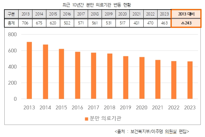 ¹Ý¸é º¸°Çº¹ÁöºÎÀÇ ¡®ÃÖ±Ù 10³â°£ ºÐ¸¸ ÀÇ·á±â°ü º¯µ¿ ÇöȲ Àڷᡯ¿¡ µû¸£¸é Áö³ 2013³â 706°³¿´´ø ºÐ¸¸ »êºÎÀΰú´Â ÇØ°¡ °¥¼ö·Ï Á¡Â÷ ÁÙ¾î 2023³â¿¡´Â 463°³¿¡ ±×Ä¡°í ÀÖ´Â °ÍÀ¸·Î ³ªÅ¸³µ´Ù. ÀÌ´Â 2013³â ´ëºñ ¾à 35%ÀÎ 243°³ÀÇ »êºÎÀΰú°¡ »ç¶óÁø °Í.