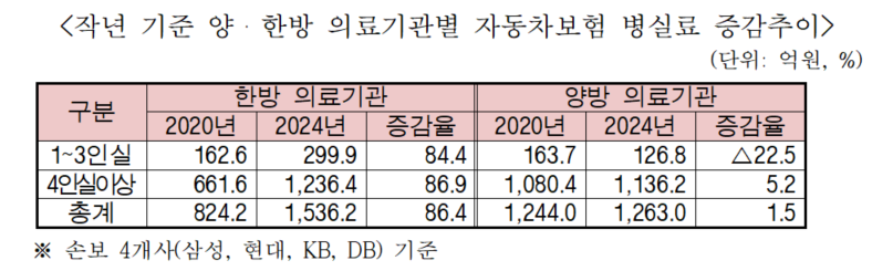 13ÀÏ ±¹È¸ Á¤¹«À§¿øÈ¸ ¼Ò¼Ó ±¹¹ÎÀÇÈû ÀÌÇå½Â ÀÇ¿øÀÌ ¼ÕÇØº¸Çè»ç 4°÷À¸·ÎºÎÅÍ ¹ÞÀº ÀÚ·á¿¡ µû¸£¸é Çѹæ ÀÇ·á±â°ü ÀÚµ¿Â÷º¸Çè º´½Ç·á û±¸¾×Àº Áö³ 2020³â 824¾ï2,000¸¸¿ø¿¡¼ 2024³â 1,536¾ï2,000¸¸¿øÀ¸·Î 4³â¸¸¿¡ 86.4% Áõ°¡ÇÑ °ÍÀ¸·Î ³ªÅ¸³µ´Ù. °°Àº ±â°£ Àǰú ÀÇ·á±â°ü ÃÑ º´½Ç·á Áõ°¡À²Àº 1.5%¿¡ ±×ÃÆ´Ù.
