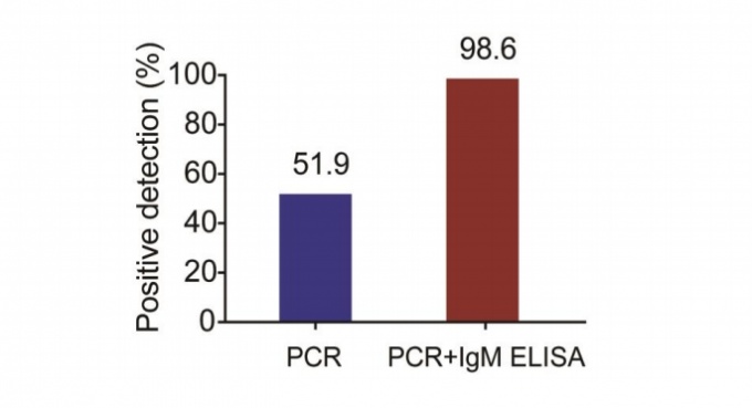 ½ÇÁ¦ ¿¬±¸ °á°ú, Áõ»óÀÌ ¹ßÇöµÇ°í ÀÏÁ¤ ±â°£ÀÌ Áö³­ ÈÄ¿¡´Â PCR°Ë»çº¸´Ù Ç×ü °Ë»çÀÎ IgM ELISA°¡ ´õ ³ôÀº ¾ç¼º ÆÇº°·üÀ» º¸¿©Áá´Ù.