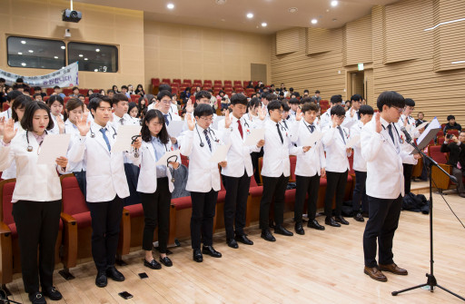 ÀÓ»ó½Ç½ÀÀ» ³ª°¡°Ô µÉ ÇлýµéÀº ¼±¼½ÄÀ» ÅëÇØ ¡®¼±¹èÀÇ»çµéÀÌ ÀÌ·èÇÑ ÀÇÇÐÁö½Ä°ú ±â¼úÀ» ¼ÒÁßÈ÷ ¿©±â°í ½º½ÂÀ» Á¸°æ ÇÒ °Í¡¯, ¡®ÀÚ½ÅÀÇ ¸öÀ» ¸Ã±æ ȯÀÚµé ´öºÐ¿¡ ÀÇÇб³À°À» ¹ÞÀ» ±âȸ¸¦ °®°Ô µÇ¾ú´Ù´Â »ç½Ç¿¡ °¨»ç ÇÒ °Í¡¯, ¡®Àΰ£ÀÌ ¼öŵǴ ¼ø°£ºÎÅÍ »ý¸íÀ» ¼ÒÁßÈ÷ ¿©±â¸ç Àΰ£À» »ç¶ûÇÏ´Â ÀÏ¿¡ ¹ÝÇÏ´Â ¾î¶°ÇÑ ÇàÀ§³ª ÀǼú¿¡ Âü¿©ÇÏÁö ¾ÊÀ» °Í¡¯, ¡®ÀÇÇÐÀ» °øºÎÇÏ´Â µ¿·á »Ó ¾Æ´Ï¶ó Ÿ º¸°ÇÀÇ·áÀεéÀ» ºñ·ÔÇÑ »çȸ±¸¼º¿øµé°ú Çù·Â ÇÒ °Í¡¯µîÀ» ¼¾àÇß´Ù.