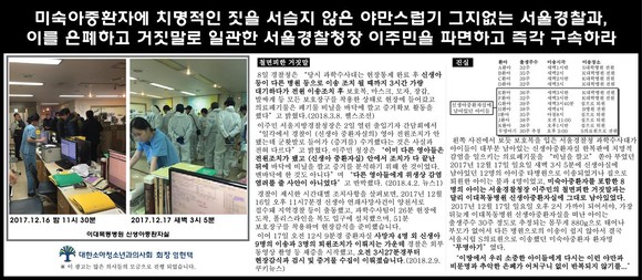 À̾î "±×·³¿¡µµ ºÒ±¸ÇÏ°í ¼¿ï°æÂûû°ú ÀÌÁֹΠûÀåÀº Áø½ÇÀ» ¼û±â°í °ÅÁþ¸»·Î ±âÀÚ°£´ãȸ¸¦ ÇÏ´Â µî »ç½ÇÀ» ÀºÆóÇϱ⿡¸¸ ±Þ±ÞÇØ ¹Ì¼÷¾ÆµéÀÇ »ý¸í°ú °Ç°À» ÁöŰ´Â ¼Ò¾ÆÃ»¼Ò³â°ú ÀÇ»çµé»Ó¸¸ ¾Æ´Ï¶ó Àü ÀÇ·á°èÀÇ °øºÐÀ» »ç°í ÀÖ´Ù"°í ¹àÇû´Ù.