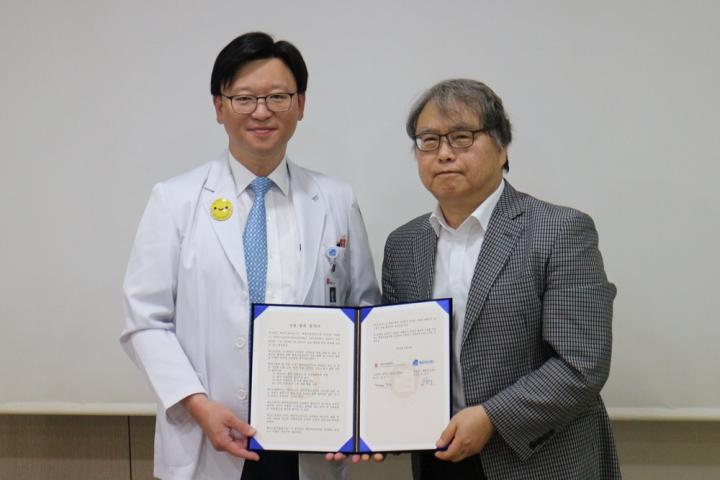 ¼¼Á¾º´¿ø ¹ÚÁø½Ä ÀÌ»çÀå°ú ¼¼°è¼Ò¾Æ½ÉÀå³×Æ®¿öÅ© ±è³²¼ö È¸ÀåÀÌ Çù¾à ÈÄ ±â³äÃÔ¿µÀ» Çϰí ÀÖ´Ù